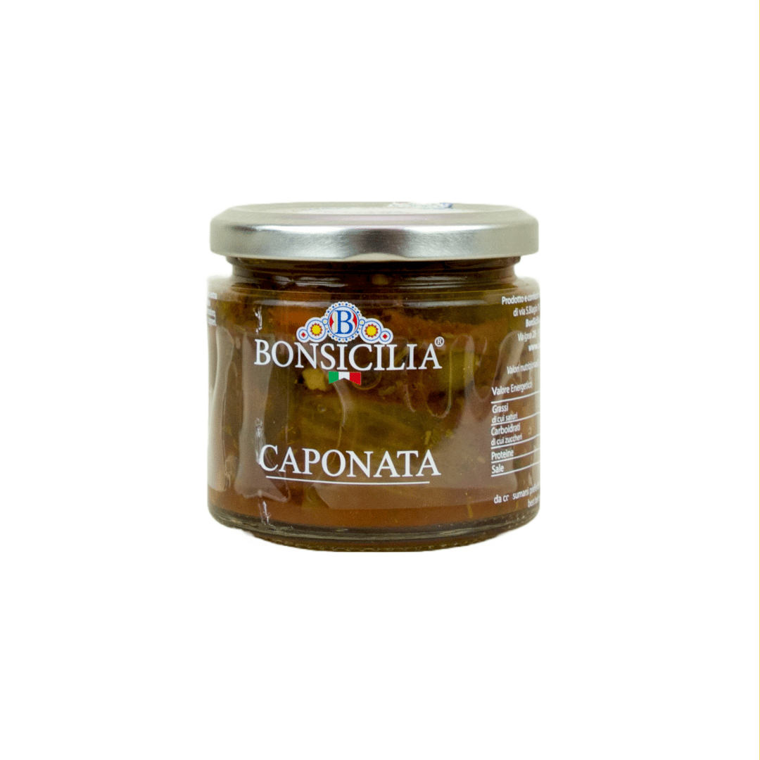 - Ingredienti: melenzane, peperoni, olio EVO, cipolla, olive verdi nocellara etnea, gambi di sedano, passata di pomodoro, zucchero, aceto, pinoli, foglie di basilico, capperi